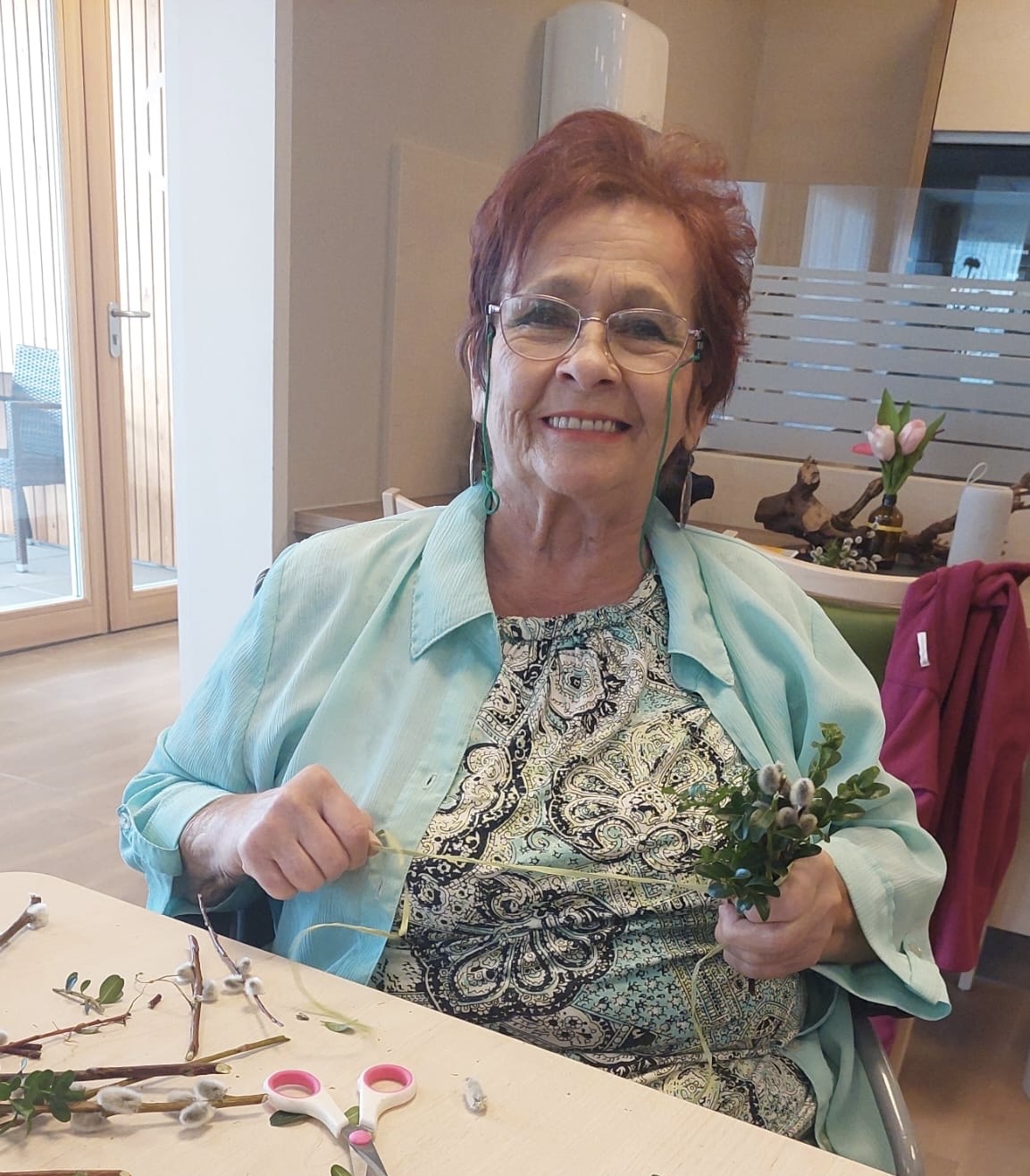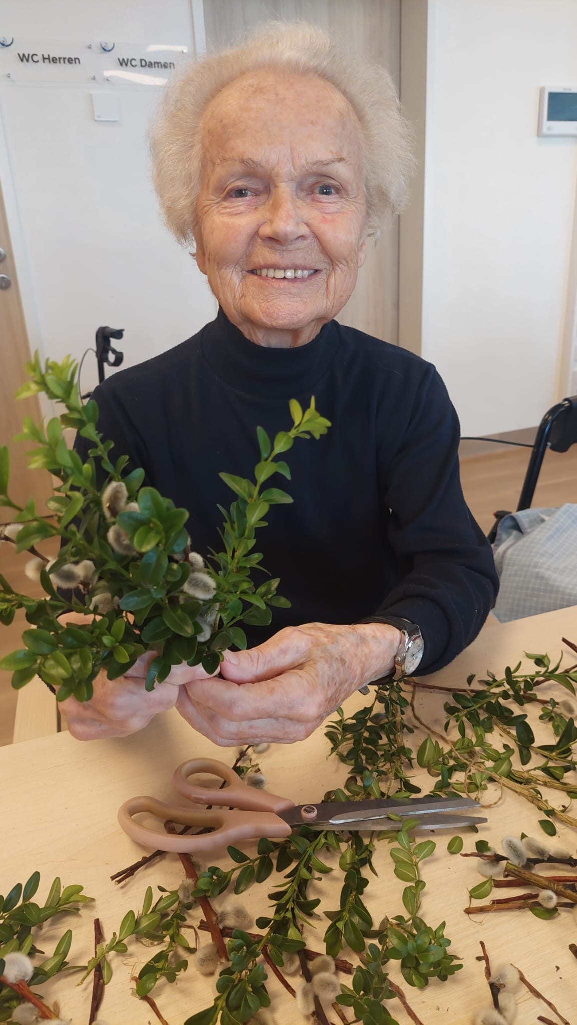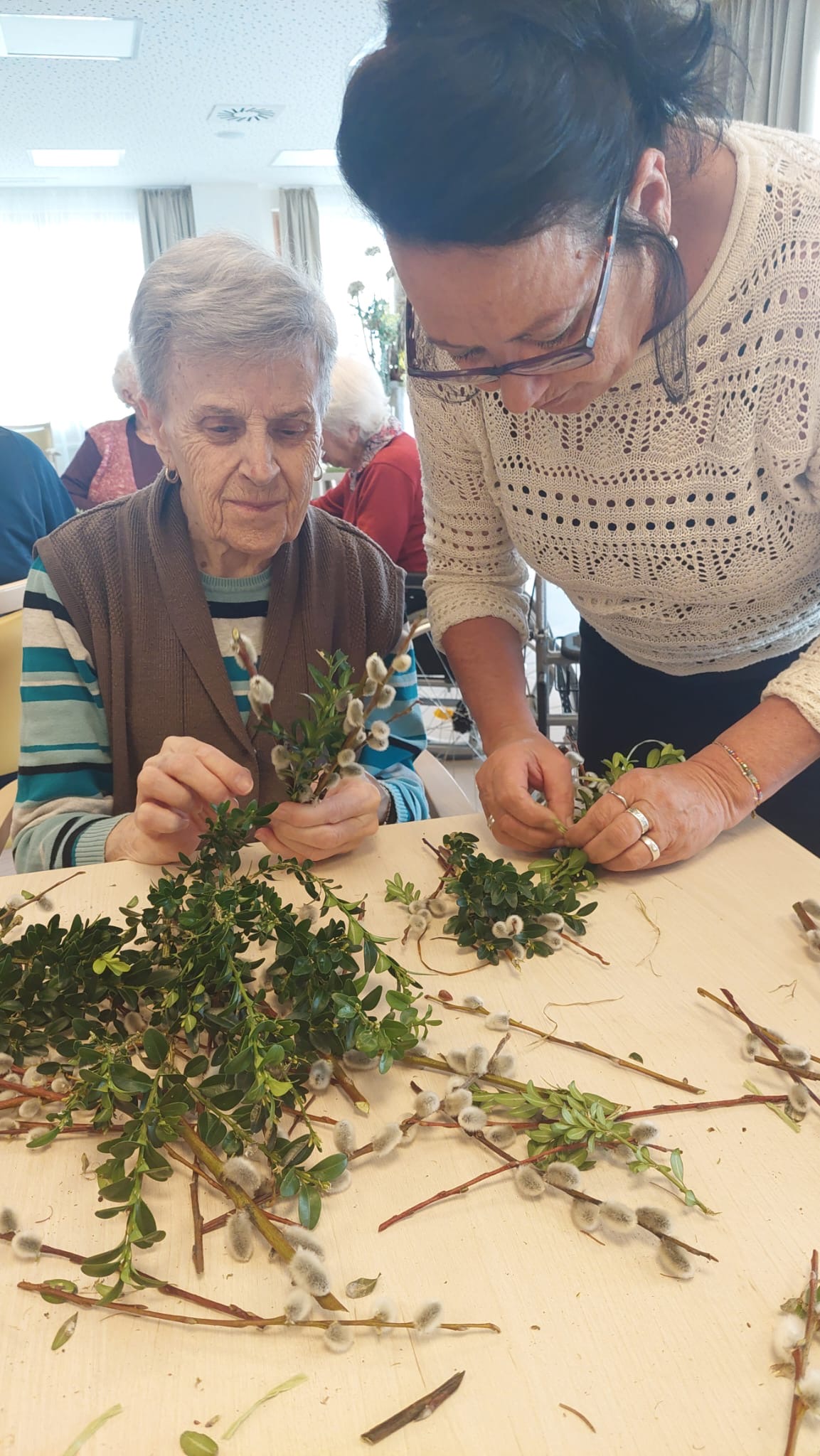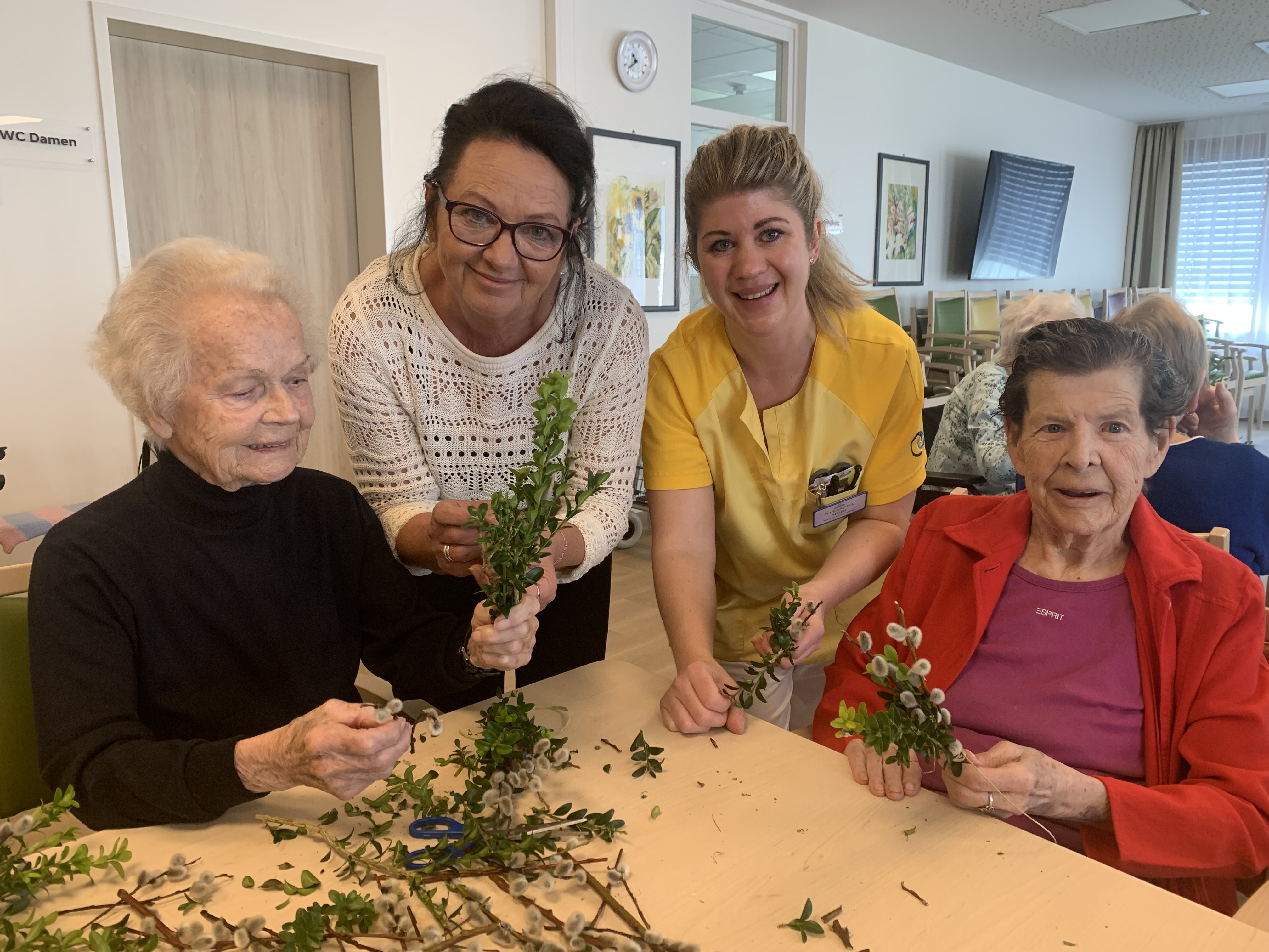 Brauchtum wird im SeneCura Pflegezentrum Vassach mit viel Liebe gepflegt und so dreht sich jetzt, kurz vor Ostern, alles um den Palmbuschen, der an den Einzug Jesu in Jerusalem erinnern soll. Seniorenbetreuung Natascha Mori und ehrenamtliche Mitarbeiterin Emma Bürger trafen sich am Dienstag, 18. März 2024 mit einer Gruppe Bewohner:innen um die traditionellen Palmbuschen zu binden. „Viele unserer BewohnerInnen sind als Kind dreimal mit dem Palmbesen um das Haus gelaufen, um so für Segen in ihrem Heim zu sorgen. Ein geweihter Palmbuschen ist ein wichtiger Bestandteil der Tradition um Ostern.“, erklärt Hausleitung Bettina Kreuzer.