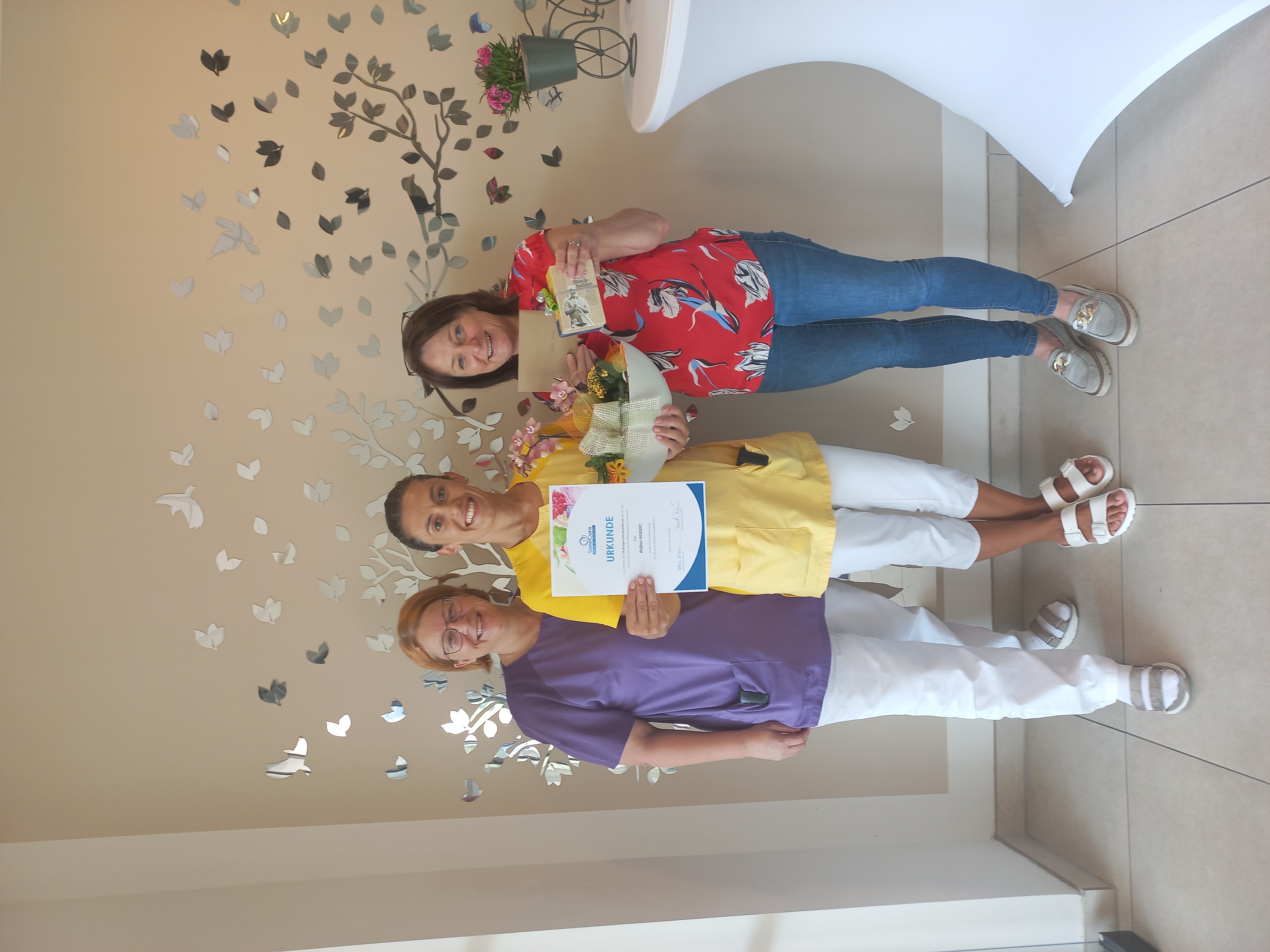 Pflegeassistentin Aldina Hodzic unterstützt das Team des SeneCura Pflegezentrums Vassach seit insgesamt 15 Jahren. Besonders beliebt ist Aldina wegen ihrer freundlichen und ruhigen Art. Hausleitung Bettina Kreuzer und Wohnbereichsleitung Bettina Kirchbaumer gratulierten herzlich und bedankten sich für die Treue und gute Zusammenarbeit.