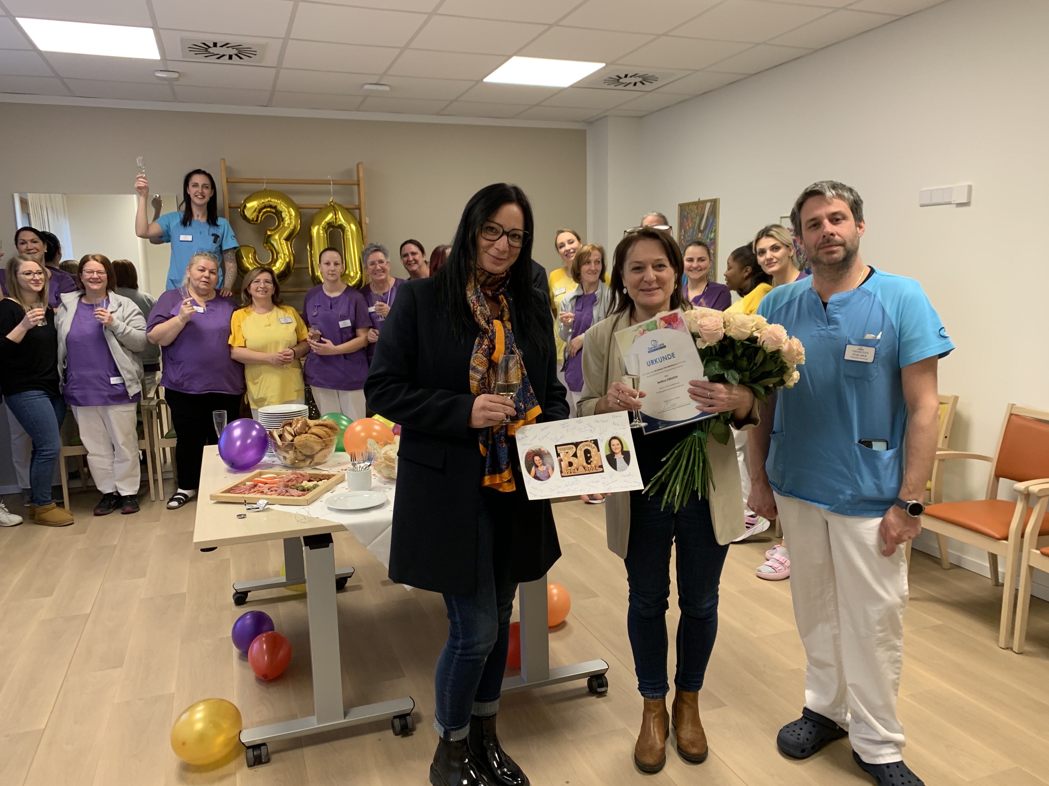 Regionaldirektorin Sara Wassermann, Pflegedienstleitung Thorsten Fercher und das gesamte Team gratulierten zum 30-jährigen Dienstjubiläum