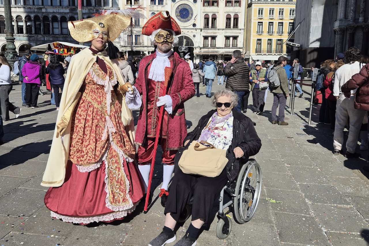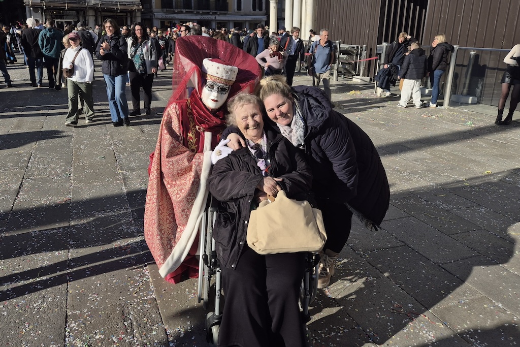 Schon lange träumte Erna Rauter, Bewohnerin des SeneCura Pflegezentrums Vassach, davon, einmal den weltberühmten Karneval in Venedig zu erleben. Dank der tatkräftigen Unterstützung des Teams konnte dieser Wunsch nun Realität werden. „Die Masken, die Farben, die Musik – es war einfach traumhaft! Ich hätte nie gedacht, dass ich das noch erleben darf“, schwärmte Erna Rauter begeistert. Nach der Reise im Bus und mit Mitarbeiterinnen Sabine Tscharf und Maritta Schweiger als Begleitpersonen an ihrer Seite konnte sie barrierefrei durch die Gassen der Lagunenstadt rollen und das bunte Treiben genießen. Der Karneval in Venedig, berühmt für seine prachtvollen Masken und historischen Kostüme, ließ die Seniorin für einen Tag die Sorgen des Alltags vergessen. „Es war, als wäre ich in eine andere Welt eingetaucht, als mir die bunten Figuren zulächelten und die Musik durch die Straßen schallte“, so Erna Rauter weiter.