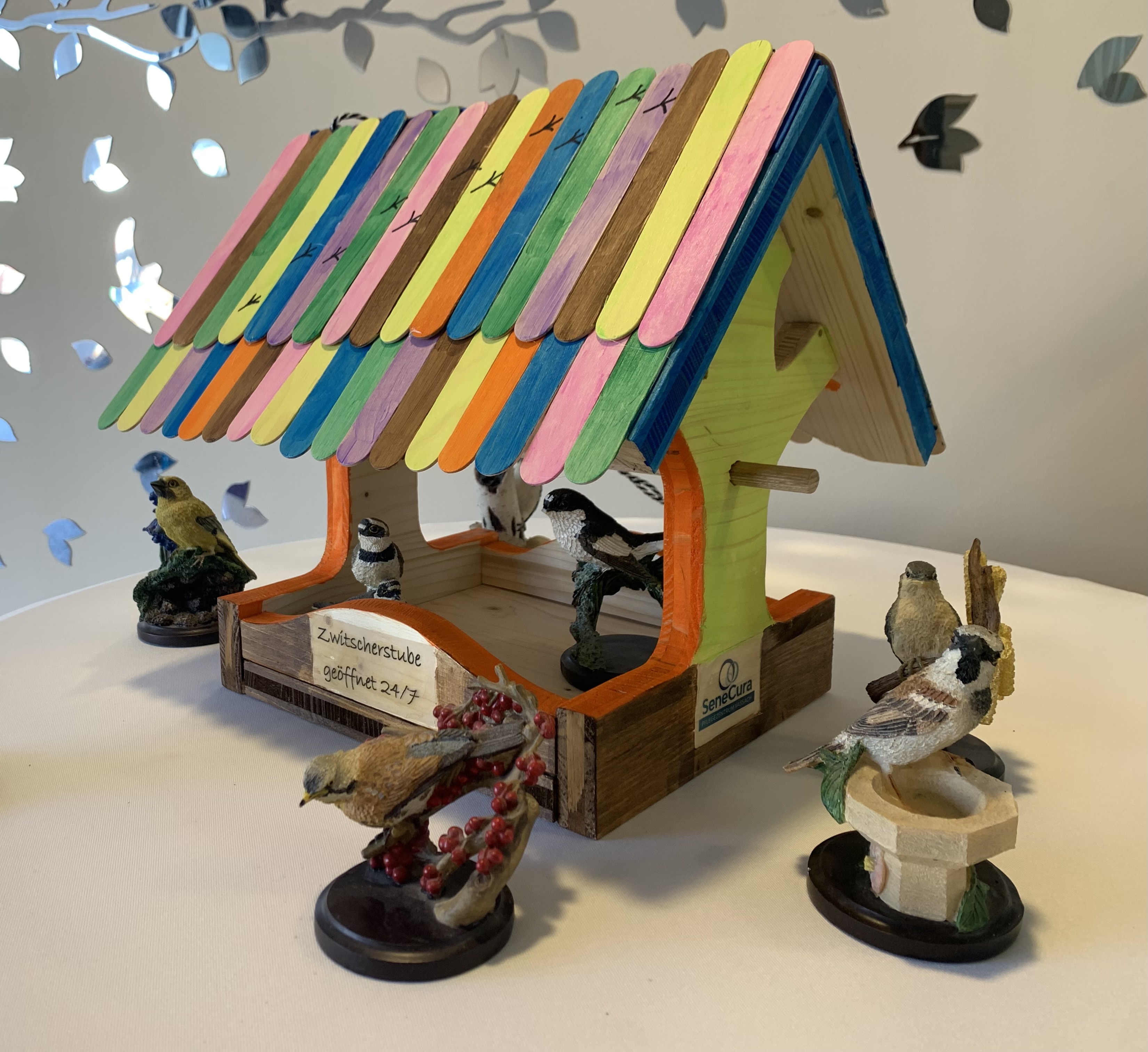 Über den dritten Platz freute sich das Team des SeneCura Sozialzentrums Wolfsberg, wo bei der Gestaltung ganz auf Natürlichkeit gesetzt wurde. Während die Bewohner gemeinsam das Zusammenbauen übernahmen, arbeiteten die Bewohnerinnen an der kreativen Gestaltung des Vogelhauses. Verwendet wurden ausschließlich Naturmaterialien aus dem eigenen Garten – komplett ohne Lacke oder künstliche Zusätze. Das Ergebnis: ein stimmiges, naturverbundenes Vogelhaus, das die Verbindung zur Umgebung sichtbar macht.