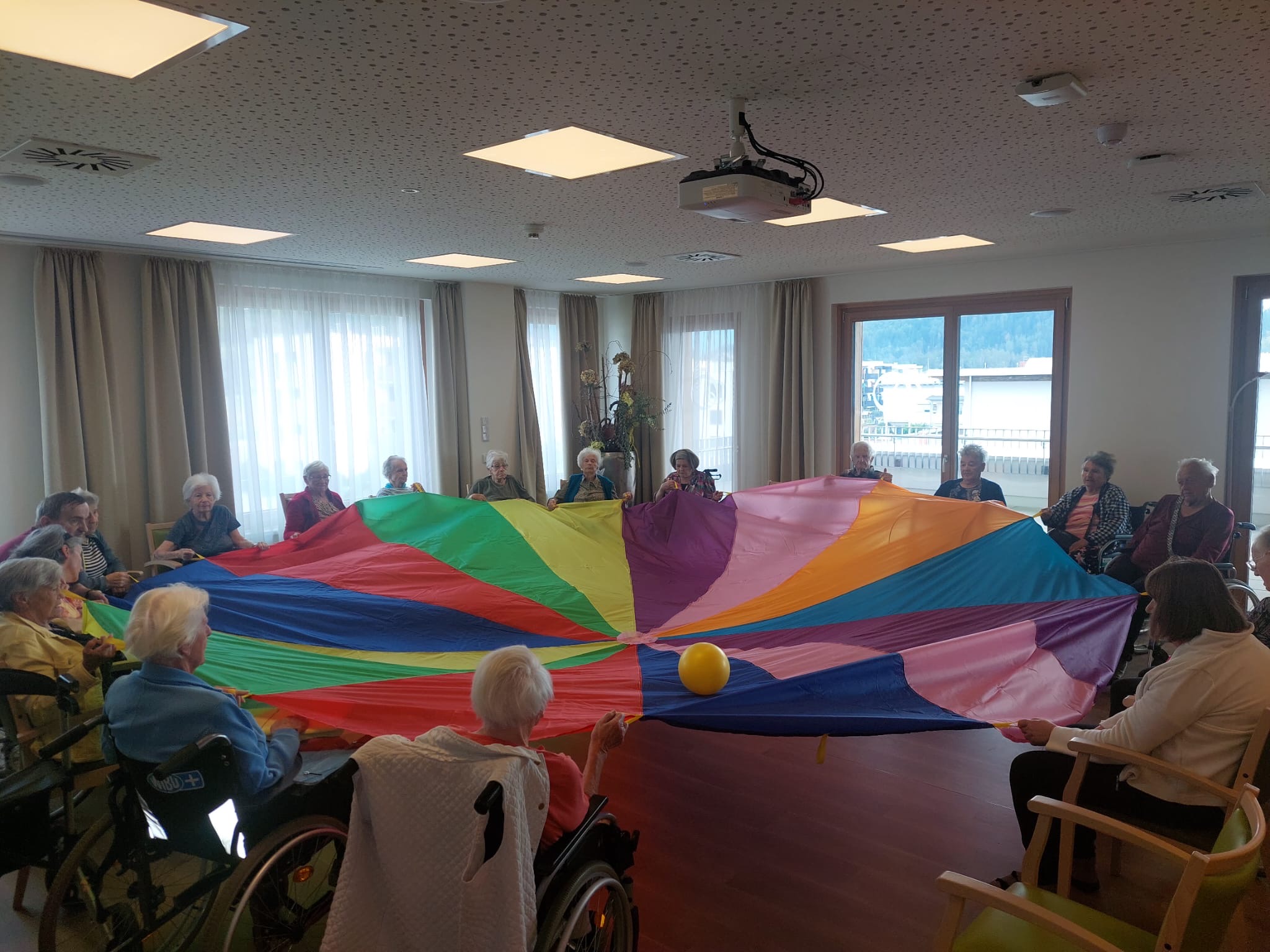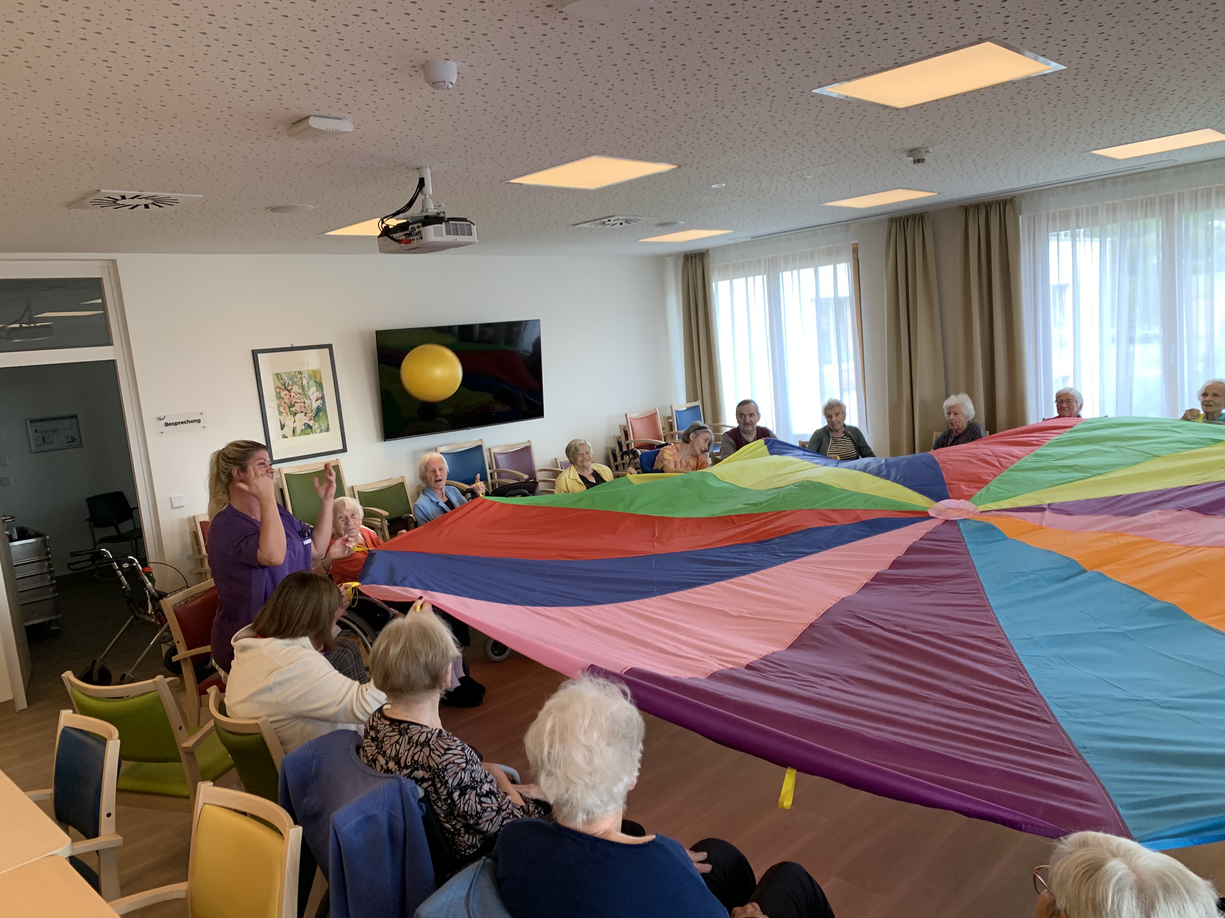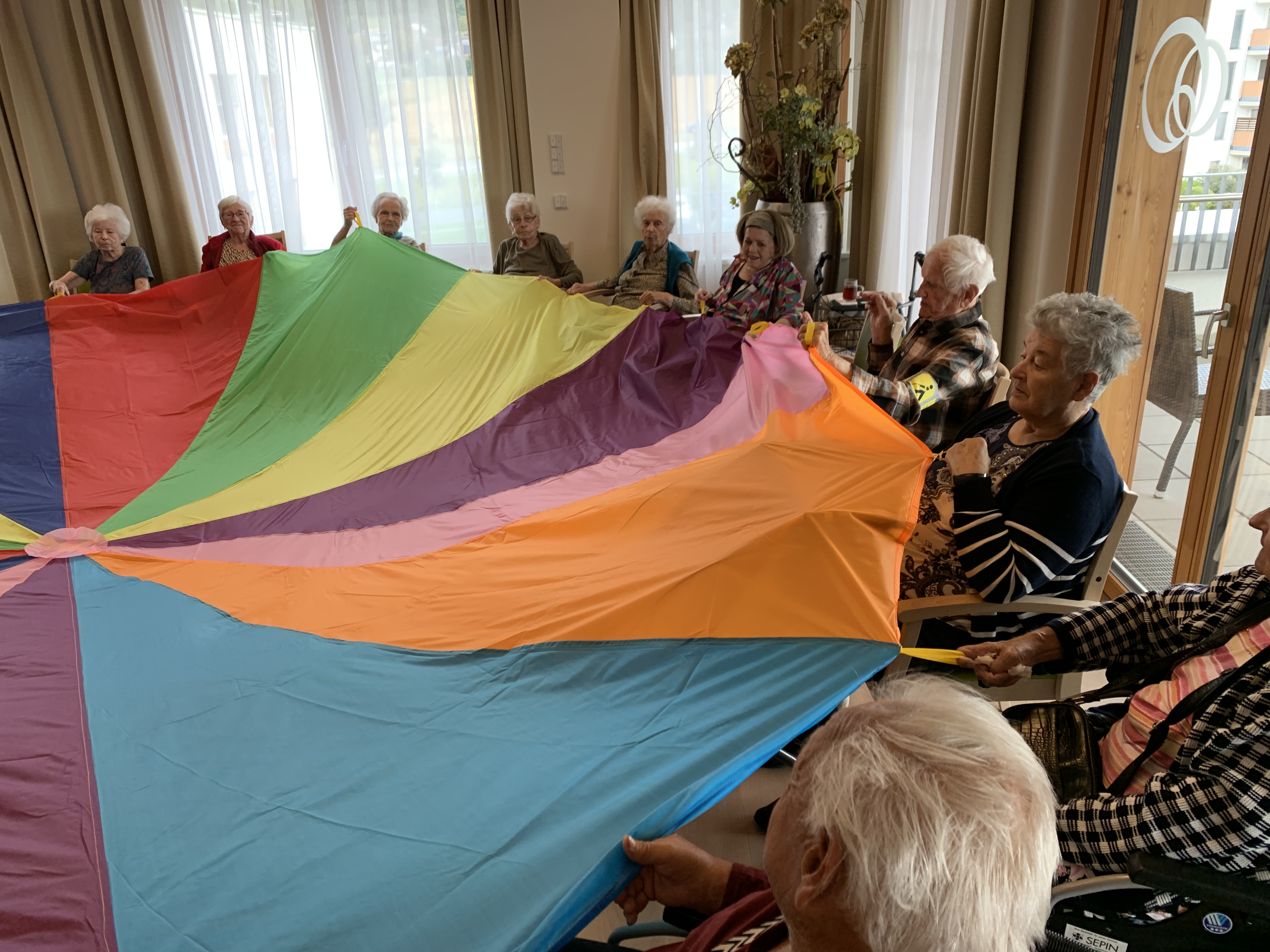 Großen Spaß mit dem Schwungtuch haben die Senior:innen im SeneCura Pflegezentrum Vassach gemeinsam mit Seniorenbetreuung Natascha Mori bei der Sitzgymnastik. Die Bewegungsspiele fördern die Hand-Augen-Koordination, Beweglichkeit, Muskelkraft und das soziale Miteinander. Mit viel Lachen und Freude wurden neue Spiele ausprobiert, die Abwechslung in die Bewegungsstunde am Vormittag bringen.